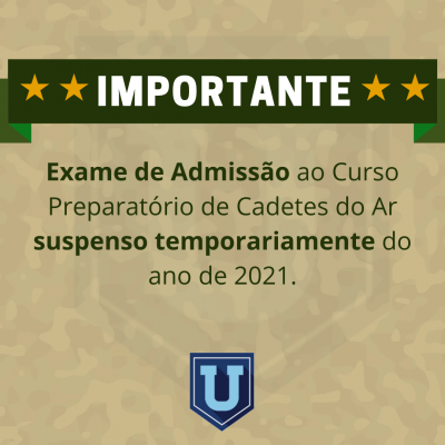 “Considerando a importância de reforçar os cuidados preventivos e diminuir os riscos de contágio e estabelecer as medidas para enfrentamento da emergência de saúde pública de importância internacional decorrente do coronavírus (COVID-19)” o DIRETOR DE ENSINO “resolve: Suspender temporariamente o Exame de Admissão ao Curso Preparatório de Cadetes do Ar do ano de 2021.” (extrato da PORTARIA DIRENS Nº 63/DCR, DE 24 DE MARÇO DE 2020) Certos da vossa compreensão, orientamos para o acompanhamento diário das publicações contidas no site Ingresso.afaepcar.aer.mil.br.